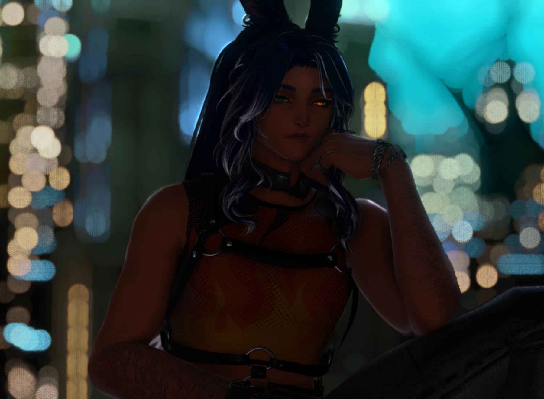 Dislikes: Disrespect, bright lights, food that is too sweetBorn in Thavnair but spending his childhood as an orphan on the streets of Ul'dah, Rezayyid has seen his fair of hardships. That's why he's taking the time to relax at UA! Whether he's showing off his love for dancing on stage, or pestering his fellow staff, he's available for conversation whenever you need. Generally wary of meeting new people, Reza is a bit rough with strangers, and he can't quite fathom why they keep coming back... It certainly has nothing to do with his intense, glowing eye or his hulking frame. While he may be gruff at first, secretly he loves the attention, and will do almost anything to please the person he's talking with in his own convoluted way.